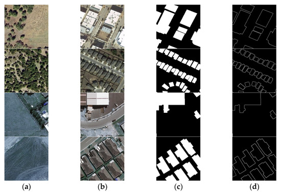 The first and second rows are example samples of 256 × 256 in the LEVIR CD training set. The remaining two rows are example samples of 256 × 256 in the BCDD training set. (a) T1 images. (b) T2 images. (c) Ground truth maps. (d) Building edge maps.