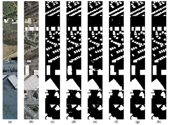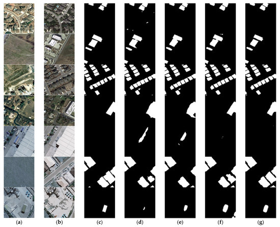 To further illustrate the method’s superiority in change detection, some visual comparisons of the results in the ablation experiment are conducted, as shown in Figure 8. As we can see, many false positives are classified as changes (rows 1 and 5 in Figure 8) and some changed buildings without clear boundaries (rows 3, 4, 6 and 7 in Figure 8) in the Siam-fusedNet model. The reason is that CD is affected by bi-temporal illumination, color and other factors. Therefore, the feature information in bi-temporal images cannot be extracted well using only the convolutional blocks in an ordinary Siam-fusedNet network. After adding the EA module to the Siam-fusedNet network, we find the edge of building visual effect is optimized to some extent (rows 1, 4 and 7 in Figure 8) because the EA module can better mine the boundary information of buildings. When we introduce the MA module to the Siam-fusedNet network, the problem of false positive changes has been significantly solved and the quality of the building boundaries has been further improved (rows 2, 3, 4, 5 and 6 in Figure 8). When the MA module and EA module are consistently added to the Siam-fusedNet, the misclassification change information is dramatically reduced, and the boundary between adjacent buildings is clear and closer to the ground truth value.