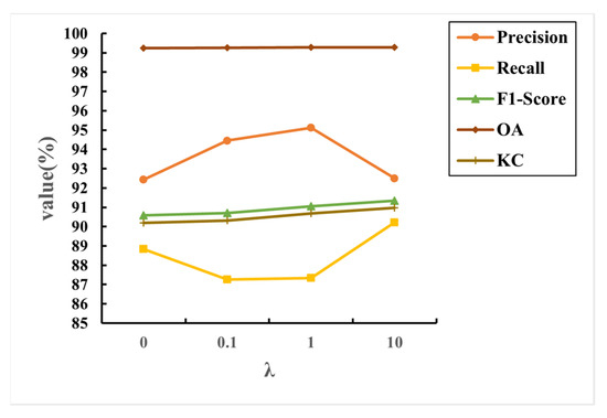 As shown in Figure 10, we calculate five different metrics for comparison and validation. When the parameter λ is 0, the performance in each metric is the lowest value. As the value of λ increases, the value of F1 and KC show steady growth, although the value of P tends to rise and then fall and the R tends to fall and then rise, which indicates that the introduced distance loss can improve the change detection effect of the building. In addition, we notice that when λ is 10, the difference between P and R is the smallest, which leads to the maximum value of F1. We can see from Figure 11 that the change detection results set to 10 can restore more details while reducing misclassification, especially for fine boundaries. Therefore, in this paper, we select λ = 10 as the best parameter of the loss function.