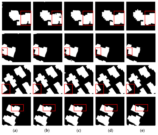 The visual results of building change detection for different λ. (a) λ is set to 0. (b) λ is set to 0.1. (c) λ is set to 1. (d) λ is set to 10. (e) Ground truth maps. The red box is to highlight the performance differences between the different λ.
