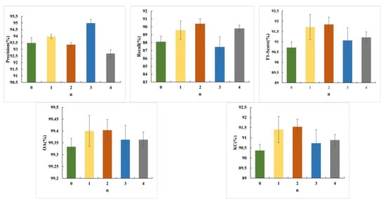 The attention module aims to refine the features of an image and is now widely used in various image interpretation tasks, especially for change detection. In our proposed model, the multiscale attention model has four layers in total. To extract more discriminative features from the different layers, we generally associate them with CBAM. At the same time, CCAM focuses on the shallow layers containing more semantic information. However, it is still worth exploring how many CCAMs can be introduced in the proposed MA module. To verify the effectiveness of CCAM, we repeated the experiment MAEANet_n 3 times, where n is the total number of CCAM in the MA model, n∈{0,1,2,3,4}. MAEANet_0 represents that no CCAM is introduced, but 4 CBAMs are used to construct the MA model. MAEANet_1 means that only one CCAM exists in the MA, the first three layers are all CBAMs, and the last layer is CCAM. MAEANet_4 represents that in the MA module, all four layers are CCAMs without the CBAM involved. Therefore, we compare the effect of n on the performance of the BCD by calculating five objective metrics such as P, R, F1, OA and KC. We noticed that the F1, OA, and KC values showed a trend of increasing and then decreasing with the increase in n. As shown in Figure 12, several experiments with n > 0 outperformed n = 0 in three indexes such as F1, OA and KC, especially when n = 2, which reached the highest in all four indexes except precision. This experimental result confirms that introducing CCAM can effectively extract features with better discrimination, which is beneficial in enhancing the identification of the changed building. However, as the number of CCAM increases, such as n >= 3, the model’s performance decreases because as we introduce CCAM to the deep features, some semantic information peculiar to the deep features will be lost, thus leading to misclassification. Therefore, we select the value of n as 2 when constructing the MA model, using CBAM for the deep features in the first two layers and CCAM for the shallow features in the last two layers, respectively.