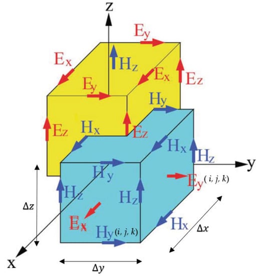 The “Yee lattice” [] is used to discretize equations of Maxwell in space. The orientation of components of the electric (E) and magnetic field (H) in the x, y, and z directions can be seen here. Here, i, j, and k denote the values of the co-ordinates in the x, y, and z directions, respectively.