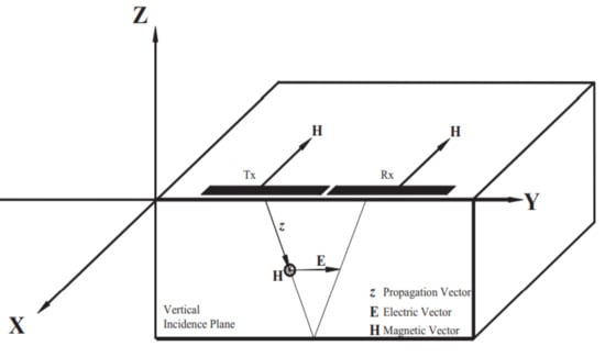 Equation (10a–c) are the transverse magnetic (TM) mode sets of equations. In the TM polarization mode of GPR data acquisition, polarization has an orientation of E within a vertical plane which is parallel to the incidence plane (Figure 2). In Figure 2, the electric field vector (E) is parallel to the Z−Y plane, which is an incident plane and perpendicular to the X−Z plane. Here, Y is the direction of measurements. Using the expression in Equation (11) and by assuming that material properties are independent of frequency, Equation (10a–c) are converted into the time domain as follows: