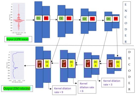 DeepLabv3+ is an architecture that performs better than many state-of-the-art picture segmentation architectures, as suggested by ref. []. DeepLabv3+ is a semantic segmentation architecture. Semantic segmentation-based algorithms are outstanding at learning the underlying relationship between parameters with the same domain []. Here, input data (GPR) and its output (EM velocity) taken for training the DCNNs are in the same domain, i.e., time. On the next page, Figure 3 illustrates our DeepLabv3+ based developed DCNNs, which are part of an encoder–decoder system and have atrous convolution (dilated filter) in the decoder part. The encoder captures inherent information in the input data, and the decoder interprets the encrypted information to generate the output model. We tuned the hyperparameters (number of layers, number of filters, size of filters, filter dilation rate) of our DeepLabv3+ based DCNNs in order to reduce the number of trainable parameters and, at the same time, maintaining good prediction accuracy. The total number of trainable parameters in our tuned DCNN is 1,287,769, which is lesser than the trainable parameters of DeepLabv3+ based recent networks such as GPRNet []. GPRNet has a total of 1,392,585 trainable parameters []. Lesser trainable parameters make our tuned DCNNs computationally fast during the training process, which saves time and, at the same time, achieves good prediction accuracy. Our tuned DCNNs also have a high convergence rate compared to GPRNet. By high convergence rate, we mean that our tuned DCNNs can reduce the loss significantly during training in a lesser number of epochs (iterations) which GPRNet is achieving in a greater number of epochs.