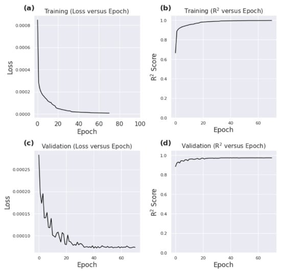 (a) Loss versus epochs plot for training, (b) R2 versus epochs plot for training, (c) loss versus epochs for validation, and (d) R2 versus epochs for validation.