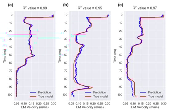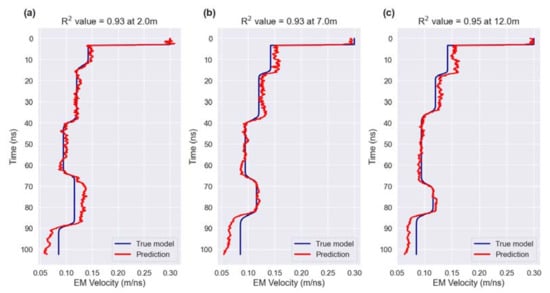 While certain artifacts were introduced in Figure 6c, the geometry and shape of each stratum remained mostly unchanged from the true model shown in Figure 6a. The accuracy of three 1D velocity models picked up at different offsets from the 2D predicted velocity model (Figure 6c) were compared with their associated true velocity models (Figure 6a). It was found that the predicted velocity models are well-matched with the true models (Figure 7a–c), in which values are 0.93 at 2.0 m offset, 0.93 at 7.0 m offset, and 0.95 at 12.0m offset. It clearly shows that our DCNNs, which were trained with 1D datasets, can predict the EM velocity from 2D GPR data with great accuracy. Therefore, to apply our DCNNs to field GPR data, which are usually in the 2D form, the DCNNs were trained with a huge number of 1D synthetic datasets covering a wider range of geological material properties.