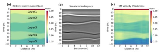 Figure 5 shows that the prediction results are reliable, with maximum values of 0.99 for randomly chosen GPR traces from the 1D testing dataset. As seen in Figure 5, it can be said here that the training of DCNNs is able to establish a relationship between the input data (GPR) and the output model (EM velocity) and allows us to outstand the accuracy while predicting outputs. The predicted velocity models are comparable to the true models. Since the velocity prediction in the 1D case is reasonably accurate, motivation was drawn to apply the trained 1D model weights on 2D synthetic GPR data to predict the 2D EM velocity model. A five-layered simple 2D velocity model was created with velocities of 0.14, 0.12, 0.09, 0.11, and 0.09 m/ns for layer 1, layer 2, layer 3, layer 4, and layer 5, respectively, as shown in Figure 6a. These EM velocity values in the 2D velocity model correspond to various geological materials []. Firstly, the 2D FDTD algorithm was applied to the 2D velocity model to collect the whole common offset shot traces. The 2D GPR data were then created by horizontally stacking the traces nearest to the appropriate sources (Figure 6b). In FDTD, the distance between the source and the receiver was kept at 5 cm. Overall, 12.55 m was the model’s horizontal distance. Figure 6c shows the predicted 2D velocity model obtained by applying model weights of DCNNs trained with 1D datasets.