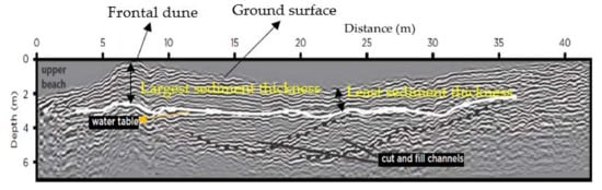 The topographically corrected processed form of field GPR data collected from the Old Bar Beach, New South Wales, Australia, by previous researchers []. Different hydrogeological features have been marked on it by them.