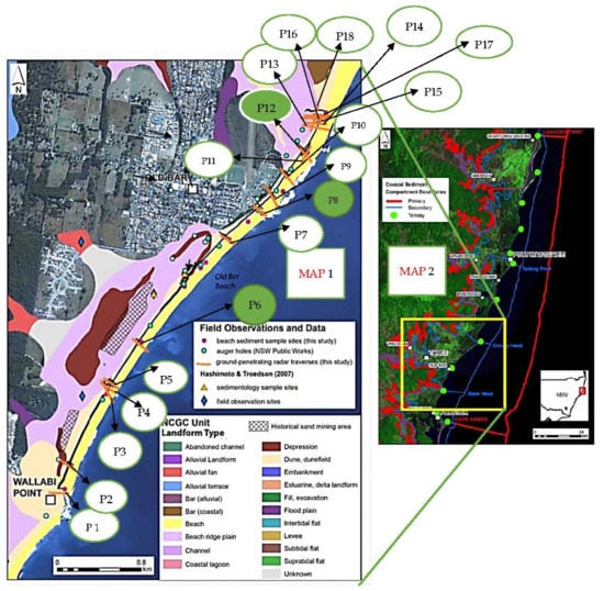 Coastal sediment compartment boundaries in MAP 2 and landform types in MAP 1 from Old Bar Beach, NSW, Australia. A GPR survey was carried out along 18 profiles (P) denoted by small saffron lines in MAP 1, which are perpendicular to the surface water line except for P11. Profiles (P) denoted by P6, P8, and P12 in green circles in MAP 1 were studied in our research. All GPR data were acquired within a geographical bounding box shown with a yellow rectangular box in MAP 2 with coordinates 152.54°, −32.35°, 152.60°, and −31.97° for west longitude, south latitude, east longitude, and north latitude, respectively [].