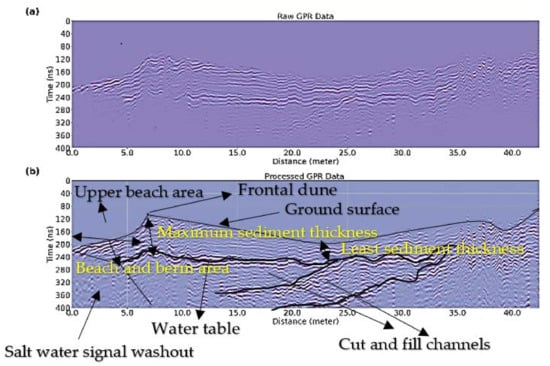 (a) The raw field GPR data, and (b) the processed GPR data. Both raw and processed GPR data are topographically corrected. On comparing Figure 10b with Figure 8, one could see the water table at around 240 ns in Figure 10b and other features such as cut and fill channels are between 240 ns and 400 ns.