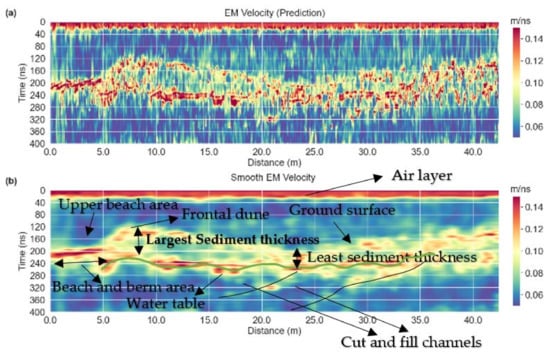 The 40–200 MHz frequency range was chosen for the band-pass filter. There is a practical reason behind choosing this range of frequency. We determined the returned signals frequency using Fast Fourier Transformation (FFT) [] to justify the chosen cut-offs for the band-pass filter. FFT converts a signal into individual spectral components and thereby provides frequency information concerning the signal. On analyzing many field GPR traces using FFT, we found that frequency from 30 MHz to 50 MHz is dominant in the returned signals, and signals have no frequency distribution in the range of 50 MHz to 200 MHz. Signals have some frequency content after 200 MHz which give information about point features in very shallow subsurface. The significant attenuation in the frequency of signals could be due to the creeping of salt water in the subsurface, which attenuates the EM pulses sent by the GPR transmitter as the locations are just beside the ocean (huge salt content). Additionally, we were concerned about the detection of layered geological features such as sediment thickness, water table, bedrock, location of former channels, etc. and not about point features. In order to detect layered features, we needed to keep the band-pass filter within a low-frequency range. The topographically corrected processed form of GPR data shown in Figure 10b was applied to trained DCNNs for field subsurface EM velocity and relative dielectric permittivity distribution ( prediction. Firstly, our DCNNs individually predicted the EM velocity models for all the GPR traces contained in field GPR data. Then, the predicted 1D velocity models were integrated to generate the 2D velocity profile (Figure 11a). To improve the visualization of reflectors in the 2D velocity, they were smoothed down using a Gaussian filter (Figure 11b).