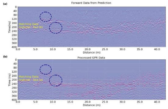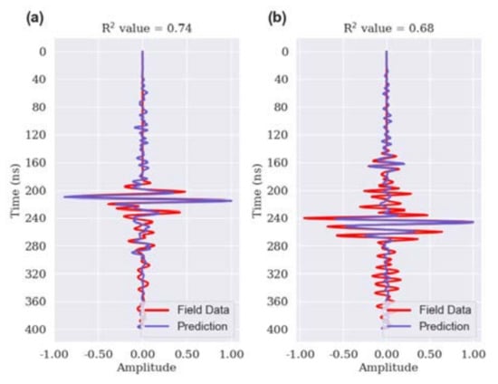 To further check the robustness of our DCNNs in forward and inverse modeling, the selection of two traces was made at different offsets from Figure 12a to compare them with the associated traces in the processed field GPR data shown in Figure 12b, and the matching results are presented in Figure 14a,b. For the GPR traces at 2.53 m and 13.32 m offset, the values are 0.74 and 0.68, respectively.