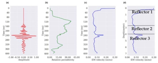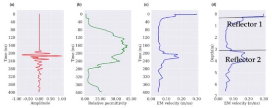 (a) GPR trace at 2.53 m offset in the time domain, (b) the variation of in the time domain, (c) EM velocity in the time domain, and (d) EM velocity in the depth domain.