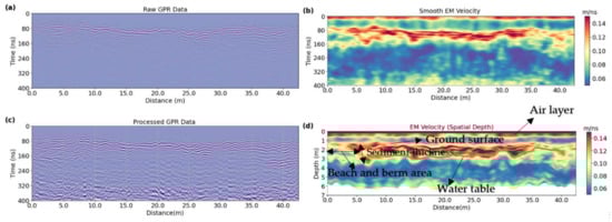 These single 1D velocity models in the time and depth domain, as well as the plot in the time domain at different locations over the study area will help researchers and coastal engineers in their point-based study of the location and aid in determining hydrogeological features such as sediment thickness, water table depth, types of soil, and the depth of the bedrock present in the subsurface in more precise manner needed for the application of coastal erosion mitigation techniques. These 1D velocity models and subsurface distribution plots will also aid in developing coastal sediments compartment boundaries and in identifying landforms. Figure 15a,c show that there is a considerable amount of variation in the GPR trace amplitude values and the EM velocity values between 200 ns and 240 ns, indicating a powerful reflector which is the ground surface (in beach and berm area) at that location. The GPR trace shown in Figure 15a (2.53 m offset) was picked up from the beach and berm area of the beach, which remains mostly saturated with ocean water. Here, varies approximately from 25 to 35 between 200 ns and 240 ns (Figure 15b). These values of correspond to the soil in saturated conditions []. As discussed earlier, Reflector 1, shown in Figure 15d, is an air layer that we have added to our algorithm knowingly to account for the direct arrival of EM pulses from the transmitter to the receiver. The ground surface in the beach and berm area is shown as Reflector 2 in Figure 15d. In Figure 16a,c, it can be noticed that there is a considerable variation in amplitude values of the GPR trace and in the EM velocity between 240 ns and 280 ns, which is the ground surface at that location indicated by Reflector 2 in Figure 16d. The values at Reflector 2 vary from 12 to 17 (Figure 16b), indicating that the soil is in a wet condition []. The water table shown as Reflector 3 has an approximate depth of 4 m (Figure 16d) at the location where this GPR trace (Figure 16a) was recorded. Reflector 1, again shown in Figure 16d, indicates the air layer. Additionally, two more topographically corrected GPR data profiles were inverted using our DCNNs to obtain a broader picture of the subsurface distribution of EM velocity and over the beach. The results are presented in Figure 17 and Figure 18.