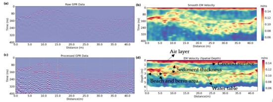 (a) Topographically corrected raw GPR data, (b) predicted velocity map in the time domain, (c) processed GPR data, and (d) velocity map in the depth domain.