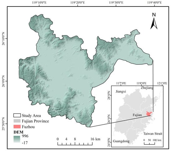 Fuzhou, the capital of Fujian Province, is located in the eastern portion of China between 25°15′–26°39′ north latitude and 118°08′–120°31′ east longitude in the downstream and coastal area of the Min River (Figure 1). The central city area covers approximately 1447 km2, and its landform belongs to a typical estuarine basin, with a relatively flat topography in the main city surrounded by Lianhua Mountain, Gu Mountain, Qi Mountain, and Wuhu Mountain. The study area has a typical subtropical monsoon climate with an average annual precipitation of 900–2100 mm and an average annual temperature of 20–25 °C. The central city of Fuzhou is the most densely populated area in Fujian Province and one of the most economically developed areas. Therefore, it is important to explore the changes in the spatial and temporal patterns of ecological environment quality in the area and to investigate the driving factors affecting the changes to enhance the sustainable development of the city.