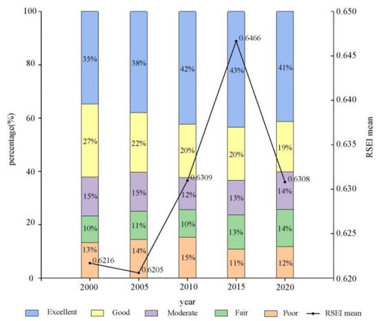 The mean values of the RSEI in Fuzhou from 2000 to 2020 were 0.6216, 0.6205, 0.6309, 0.6466, and 0.6308 for each of the five investigated years, respectively, and the proportion of areas with an excellent rating (0.8–1) increased from 38% to 41%. This is consistent with the results reported by scholars in a previous study [20]. However, the improvement with respect to the mean value is not significant, mainly because the topography of Fuzhou City led to the deterioration of the RSEI in the central area, whereas the mountains in the suburbs are protected by environmental policy, resulting in a gradual increase in the number of areas with good RSEI (Figure 2). This is the main reason why the mean value of the RSEI does not change much. Therefore, it is necessary to study the urban–rural RSEI drivers in a comparative manner in future research.