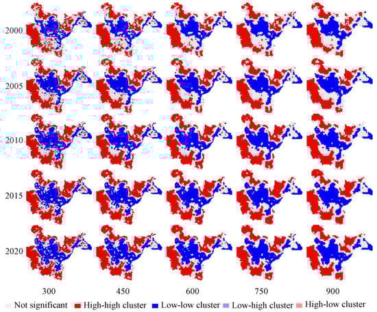 Moran’s I is calculated at each scale from 2000 to 2020 in Table 4, with all z values exceeding 1.96, suggesting strong spatial autocorrelation of the RSEI in the research area. On the same scale, Moran’s I showed an increasing tendency from 2000 to 2010 and a gradually decreasing trend from 2010 to 2020. Generally, Moran’s I in 2020 is higher than in 2000, indicating that the spatial aggregation effect of the RSEI in Fuzhou City has been intensified, showing a bifurcation phenomenon. As the scale increases, the Moran index appears to decrease, and the z value begins to fall, indicating that as the sampling grid increases, the homogenization between grids increases, and when the grid becomes too large, information within the grid is lost, and the RSEI is no longer spatially self-relevant.