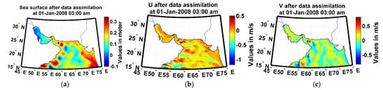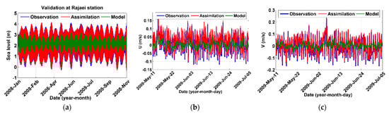 (a) Sea level height after data assimilation (calibration); (b) east–west component (u) of the SSC after data assimilation; (c) north–south component (v) of the SSC after data assimilation.