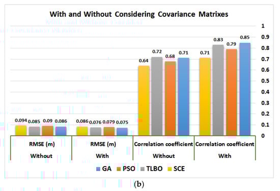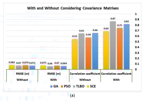Three goals were pursued here: (i) choosing the appropriate optimization method for calibration; (ii) selecting the correct weights; and (iii) determining the effect of the defined objective function on the results. For the first goal, the performance of each optimization method was evaluated following the assimilation of coastal tide gauge and current meter data. Comparisons were made between the assimilated model, the coastal tide gauges, and the current meter observations, both with and without the variance covariance matrices of the objective functions (Equation (1)). In Figure 3, the mean correlation coefficient and root mean square error (RMSE) are depicted for each optimization method in all the tide gauge stations (except control stations) and current meter stations (except control stations), respectively, with and without considering the variance–covariance matrices. The results of this study indicate that, in general, the GA and TLBO methods provided better performances (more correlation and fewer errors compared to local data) than the PSO and SCE methods. In addition, considering the variance–covariance matrices increased the correlation between the assimilated model and local data. Particularly, the correlation coefficients between the assimilated model and coastal tide gauge observations, respectively, in the GA, PSO, TLBO, and SCE methods without considering the variance–covariance matrices were equal to 0.66, 0.58, 0.65, and 0.55; by considering them, they were equal to 0.82, 0.75, 0.87, and 0.69. The correlation coefficients between the assimilated model and the current meter observations, both without considering the variance–covariance matrices and considering them in the GA, PSO, TLBO, and SCE methods, were equal to 0.71, 0.68, 0.72, and 0.64 and 0.85, 0.79, 0.83, and 0.71, respectively.
