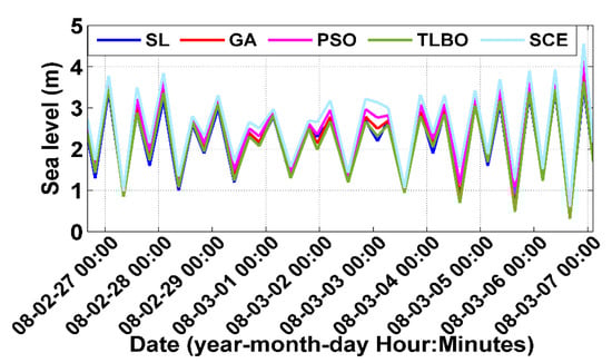 Further investigation of the performances of the mentioned optimization methods was provided by comparing the assimilated model with those of the control stations at coastal tide gauge (Rajaei and Khark) and current meter stations (Nayband station). In the GA, PSO, TLBO, and SCE methods, the RMSE values between the assimilated model and the two control stations (Rajaei and Khark) were equal to 0.082, 0.090, 0.071, and 0.11 m and 0.091, 0.10, 0.086, and 0.13 m, respectively. For the east–west component of the SSC, the RMSE values were equal to 0.084, 0.088, 0.069, and 0.097 m/s, while for the north–south component, they were equal to 0.081, 0.085, 0.073, and 0.10 m/s. As a typical example, Figure 4 illustrates the estimation of the SLH at the Rajaei tide gauge station using each of the optimization methods. According to the obtained results, the TLBO method performed better than the other methods.