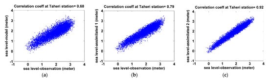 For the second goal, the effect of the variance–covariance matrices (Equation (1)) on data assimilation was investigated. To this end, the process of data assimilation was performed once considering the variance–covariance matrices and then without considering the variance–covariance matrices (unit weight). When the variance–covariance matrices were used, the correlation between the observations and the assimilated model increased, and the assimilated model became closer to the observed data. Figure 5, for a typical example, shows the correlations between the SLH observations at the Rajaei tide gauge station and the model in three cases: (a) before data assimilation, (b) after data assimilation without considering the variance–covariance matrices, and (c) considering the variance–covariance matrices. Figure 6, for a typical example, shows the correlations between the horizontal SSC components (u, v) at the Taheri current meter station and the model in three cases similar to those in Figure 5.