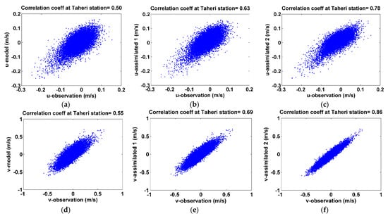 The correlations between the east–west component (u) of the SSC at Taheri current meter station and the model in three cases: (a) before data assimilation (calibration), (b) after data assimilation without considering the variance–covariance matrices, and (c) after considering the variance–covariance matrices. The correlations between the observations of the north–south component (v) of the SSC at the Taheri current meter station and the model in three cases: (d) before data assimilation, (e) after data assimilation without considering variance–covariance matrixes, and (f) considering variance–covariance matrixes.