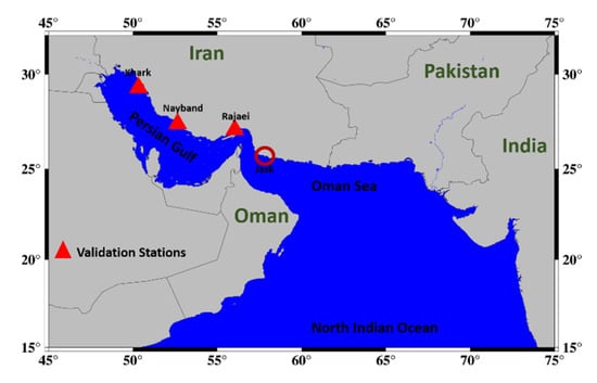 - Soltanpour, A.; Pirooznia, M.; Aminjafari, S.; Zareian, P. Persian Gulf and Oman sea tide modeling using satellite altimetry and tide Gauge data (TM-IR01). Mar. Georesour. Geotechnol. 2017, 36, 677–687. [Google Scholar] [CrossRef]