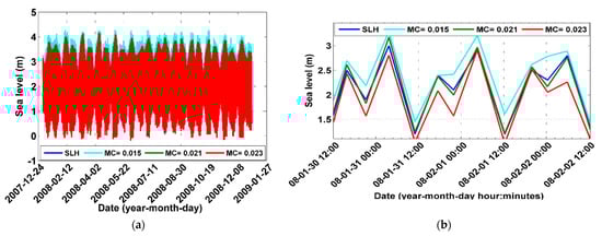 (a) Performances of Manning coefficients (MCs) of 0.015, 0.021, and 0.023 at Rajaei control station and their effects on SLH; (b) separated portion of (a) to show more details.