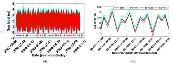 (a) Performances of Smagorinsky coefficients (SCs) of 0.13, 0.15, and 0.17 at Rajaei control station and their effects on SLH; (b) separated portion of (a) to illustrate more details.