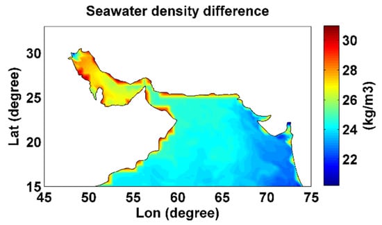 As a result of the changes in various parameters, density was the dominant parameter in the northern and central parts of the Persian Gulf. SSCs caused by the wind dominated the northwestern part of the Persian Gulf. Figure 16 shows a typical example of the difference in density of seawater on 1 January 2008 03:00 a.m. This difference was the difference between the density of seawater and water (density of seawater (kg/m3)—1000 (kg/m3)).
