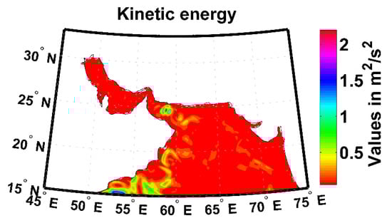 In the above relation, and are, respectively, the mean SSC components in the east–west and north–south directions, and E is the mean kinetic energy caused by the SSC. Figure 17 shows the mean kinetic energy in the study area. In the Oman Sea and near Jask port, it was possible to use the kinetic energy of the currents. In this context, it is important to note that the obtained kinetic energy values were acceptable based on the estimation of the error of the SSC components using in situ data (Table 5).