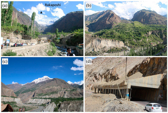 As a result of the collision of the Indian and Asian plates, the principal tectonic expression in the Hunza area is the thrust slip between the Main Karakoram Thrust (MKT) and the Karakoram Fault [25] (Figure 1c). The complex landforms represented by the crisscrossing gullies and fragmented bedrock are evidence of active movement related to the MKT and other small faults [38]. As a zone with intensive tectonics, this area has been reported as the highest in the world in terms of frequent seismicity and earthquakes exceeding Mw 6 [39]. Therefore, the study area is heavily affected by widespread slope movement [40,41] owing to the complex impact of the intensive tectonic activity and fragile geology. Landslide hazards in the Hunza Valley are also closely related to the engineering work along the KKH, and the erosion of the Hunza River. The large landslide Atta Abad dammed the Hunza River and blocked the KKH in 2010. This prompted KKH relocation and upgrading after submersion by the Atta Abad landslide dam lake. Five open tunnels were constructed to reduce the direct impact of landslides on the highway along the new KKH (Figure 2d). Landslide hazards are frequent and have resulted in traffic disruption and severe material losses, which are major constraints on human life and socioeconomic development [7]. They therefore require intensive study.