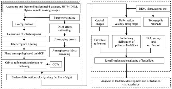 The methodologies and processing used in the present study consisted of the following steps: data preparation, displacement and velocity monitoring based on SBAS-InSAR and preliminary interpretation, field survey, validation of landslide inventory, compilation of a dataset of the latest landslides, and landslide distribution mechanism analysis. A flow chart of this methodology is illustrated in Figure 3.
