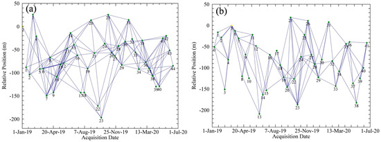 Spatiotemporal baseline map of SBAS-InSAR interferometric data of ascending track (a) and descending track (b).