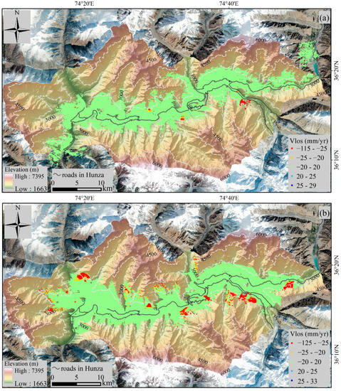 Displacement velocity along the line of sight (Vlos) monitored by SBAS-InSAR applying the ascending (Path 27, Frame 117, in (a)) and descending orbit data (Path 107, Frame 473, in (b)) Sentinel-1A dataset. The black line represents the roads in the Hunza Valley.