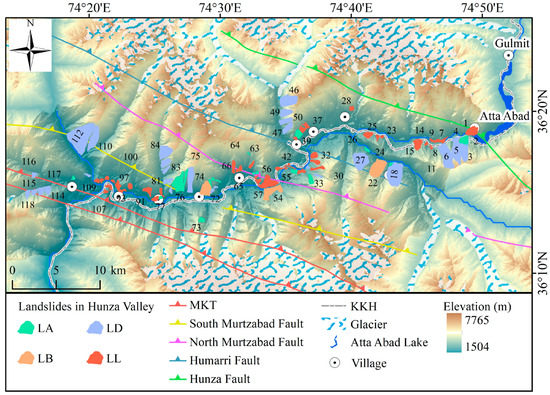 Landslides are one of the most common and widespread natural hazards, and they cause major damage to properties, infrastructures, and communities, as well as numerous casualties worldwide [1,2,3]. The Indus River Basin in northern Pakistan hosts high mountains and is prone to multiple hazards [4,5]. In this region, the Hunza Valley with a high population density is one part of Gilgit-Baltistan and has been marked by its vulnerability to multiple geo-hazards including landslides, avalanches, and flash floods. On 4 January 2010, a huge landslide triggered by thrust fault activities caused 20 fatalities at Atta Abad and formed a 120 m high dam [6,7,8]. The landslide deposition blocked the Hunza River and subsequently impounded a reservoir with a length of 21 km, and the Karakoram Highway along the bank of Hunza River was disrupted [8]. Recently, a catastrophic rock-ice avalanche on 7 February 2021 at Chamoli in the Indian Himalayas caused severe damage to the ecology and safety of downstream areas [9]. A rock avalanche occurred in the channel of the Boultar Glacier within the Hunza River watershed in 1986, which was the first rock avalanche event reported in Karakoram [10]. The deposits of the rock avalanche covered an area of 3.5 km2 and were transferred by glaciers for many years. The Ganesh-Saukien is another example of a rock avalanche [8,11]. Widespread landslides expose this area to the potential for building collapse and ever-present damage. These catastrophes usually occurred without warning and were not predicted by researchers, resulting in underestimated adverse consequences and loss. A comprehensive landslide inventory, however, would provide the fundamental information base for further assessment of landslide susceptibility and risk [12]. Knowledge of the location and distribution of landslides is vital for predicting affected areas and for quantifying hazard risk. An up-to-date landslide inventory of the Hunza Valley including the deformation velocity, pattern of the deformation process, and field surveyed features would be significant.