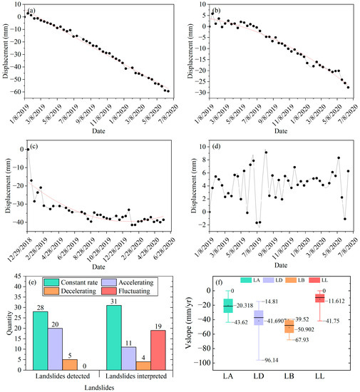 The SBAS-InSAR derived deformation velocity is valuable when delineating the boundary of an active landslide. In addition, the time series analysis of deformation in the monitoring period is useful for investigating the landslide development pattern. Previous studies have proposed that the statue of deformation curve is of value when indicating the pattern of landslide development, and the extra high acceleration is a criterion of the possibility of failure [63,64,65]. It is vital to explore the deformation pattern in the monitoring period not only to gain the knowledge of potential landslides but also to choose typical objects to study specifically for risk management. The displacement trends of each landslide were checked using the time series displacement data and, considering geomorphological features observed in the field and on images, were classified manually to ensure accuracy. In this study, the trends of the landslide deformation process were classified into constant rate (Figure 9a), accelerating (Figure 9b), decelerating (Figure 9c), and fluctuating (Figure 9d). Of these landslides detected by SBAS-InSAR, 28 experienced constant rate deformation, 20 experienced accelerating deformation, and 5 experienced decelerating deformation (Figure 9e). On the other hand, the interpreted landslides experiencing constant rate, accelerating, decelerating, and fluctuating were 31, 11, 4, and 19, respectively (Figure 9e). It was determined that the majority of detected landslides (90%) had experienced displacement with constant rate or accelerating rate, and the majority of landslide supplied from the literature (77%) had experienced displacement with constant or fluctuating rate (Figure 9e). It was clear that the landslides interpreted from the literature experienced steady deformation or irregular surface movement, demonstrating that the detected landslides were more likely to develop into accelerating rate and had an approximate risk of failure in the future [35].