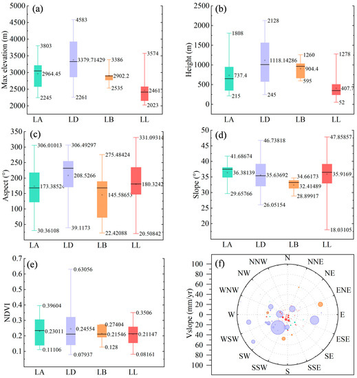 Analysis of multi-source landslide development characteristics of (a) elevation, (b) height, (c) slope aspect, (d) slope, and (e) NDVI, and (f) the colorful dots of different sizes indicate the landslide sources and their area. Its quadrant and radial locations represent the aspect and displacement velocity. The landslide statistics include landslides detected by ascending (LA), descending (LD), both ascending and descending datasets (LB) and the landslides from the literature (LL). The max–min–mean are marked on the graph.
