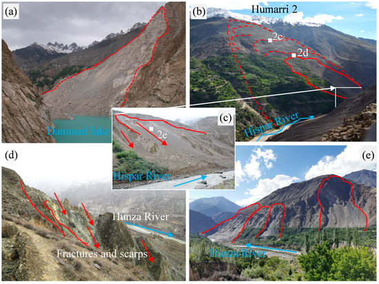 Photographs of a typical large landslide in the Hunza Valley controlled by the faults and river erosion. (a) Atta Abad. (b,c) Humarri-2 and secondary landslide, toe of Humarri. (d) Mayoon. (e) Jizalabad.