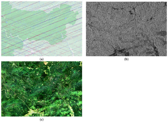 Satellite imagery downloaded using Google Earth Engine over the same location in Black Forest, Germany [centre point: 48.528N, 8.228E]. (a) Lidar, GEDI. Footprints of data are shown by coloured dots ranging from pink (low height) to blue (large height). (b) SAR HV, ALOS PALSAR-2 annual mosaic, shown with no filtering. No backscatter is black and high backscatter is white. (c) Optical Imagery, Sentinel-2. Bands 2, 3 and 4 are shown to create a RGB image, with a 90% stretch applied. (a) GEDI footprint data, lidar imagery; (b) ALOS-PALSAR-2 annual mosaic, SAR imagery; (c) Sentinel-2 bands: RGB, optical imagery.