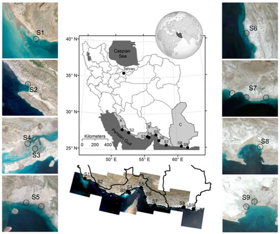 All mangrove sites in Persian Gulf and Gulf of Oman coasts were considered as the study sites, i.e., Mond protected area (S1) and Nayband National Park (S2) in Bushehr Province; Hara protected area (S3), Haraye Khamir protected area (S4), Hara Tiab and Minab protected area (S5), Hara Roud-e Gaz protected area (S6), and Hara-e Gabrik and Jask protected area (S7) in Hormozgan Province; and Chabahar hara forests (S8) and Bahookalat protected area (S9) in Sistan and Baluchestan Province (Figure 1). Some subsites are defined within each major mangrove site; however, they are considered as one site in this study. For instance, there are two different subsites within S5, i.e., the forests located at the mouth of the Shoor River and the forests distributed in Tiab Harbor estuary. Additionally, S7 has three subsites: Jask Harbour and Sourgalm and Gabrik villages. Hara Biosphere Reserve is one of 13 UNESCO biosphere reserves of Iran, registered in 1976, which consists of Qeshm Island (S3) and Khamir Harbor (S4).