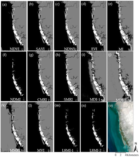 Results of the vegetation indices (i.e., NDVI, SAVI, NDWI, and EVI, shown in panels (a–d)) and mangrove-specific indices (i.e., MI, NDMI, CMRI, SMRI, MDI, MMRI, MVI, and L8MI, shown in panels (e–n)) from the low-tide and multi-tidal Landsat 8 image in S6 (Hara Roud-e Gaz protected area in Figure 1). (o) is the low-tide Landsat 8 image in S6. (Note: MDI-1 and L8MI were computed by SWIR1 (MDI-1 and L8MI-1, respectively) and SWIR2 (MDI-2 and L8MI-2, respectively) wavelengths. White areas represent mangrove forests).
