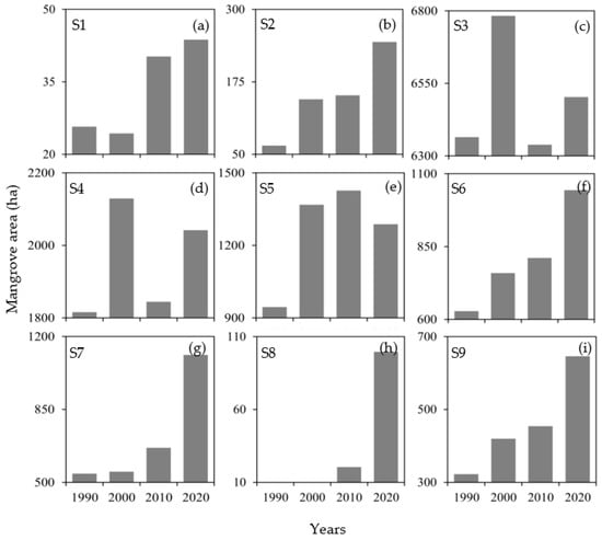The SMRI-derived mangrove area within each study site was compared from 1990 to 2020 (Figure 5). The results indicated dissimilarity in area changes of mangroves between the study sites. An area increase over the mangrove habitats was observed in S1, S2, and S6 to S9 during the period 1990–2020. The highest increase rate was observed in S2 and S8, auxh that the total area of mangroves changed from 64.9 and 0.0 ha in 1990 to 243.9 and 99.6 ha in 2020, respectively (Figure 5b,h). No mangrove forests were observed in S8 on the SMRI images in 1990 and 2000, although small patches were established in 2010 (20.5 ha) and rapidly developed in 2020 (99.6 ha) (Figure 5h). Alternatively, the study sites of S3 and S4, with the largest mangrove distribution in 1990 (6364.1 and 1815.3 ha, respectively), showed no significant increase in 2020 (6502.6 and 2041.6 ha, respectively). However, a sharp decline was observed in S3 and S4 from 2000 (6782.4 and 2129.2 ha, respectively) to 2010 (6338.3 and 1844.2 ha, respectively) (Figure 5c,d). Additionally, the mangrove areas were approximately doubled in S7 and S9 within the study period (from 541.7 and 322.2 ha in 1990 to 1111.2 and 645.9 ha in 2020, respectively) (Figure 5g,i). In general, the distribution of mangrove forests in all study sites increased from 10,706.2 to 12,177.3 ha during the decade 1990–2000 and decreased to 11,749.9 in 2010 but expanded to 13,019.1 ha in 2020.