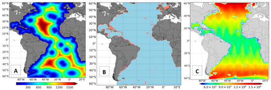 Next, a grid mask was built to analyze the water depth (ETOPO1) [51,52] and distance to the coast (GSFC/NASA, Figure 1A) of the grid points, taking the same latitude and longitude arrays from the ERA5 grid, selected for the Atlantic Ocean. Queffeulou and Croizé-Fillon [53], Young et al. [42], and Campos et al. [50] discussed the degraded accuracy of altimeters and scatterometers at coastal waters near land and they recommend excluding satellite data close to the coast. Therefore, a minimum water depth of 80 m and a distance to the nearest coast of 50 km were fixed at the grid mask to guarantee the satellite records are reliable and the matchups satellite/reanalysis can be used for validation and calibration (Figure 1B).