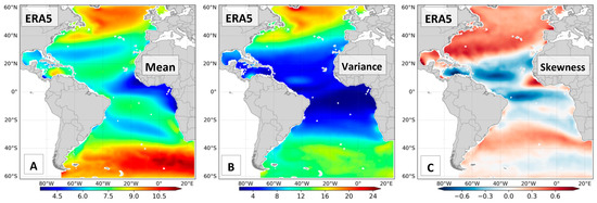 The first comparisons between ERA5 wind speeds with satellite data are performed using the first three moments: mean, variance, and skewness. They reflect how well the distribution functions of both datasets agree with each other. For metocean analysis, especially extreme value analysis (EVA), the proper representation of the shape of the distribution is important to allow reliable extrapolations to longer return values—which depend on the variance and skewness. If the map shows positive skewness, the tail of the distribution tends to be longer and evolves towards higher values, i.e., the probability of strong winds is higher. Inversely, when the skew is negative and variance is low, the wind intensity rarely increases to values distant from the mean. Most importantly, the probabilistic moments are a simple way to use statistics to start investigating whether the physics implemented in the atmospheric model are properly representing the true environment state or not.