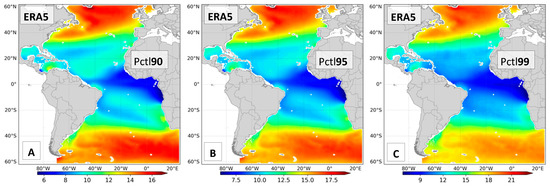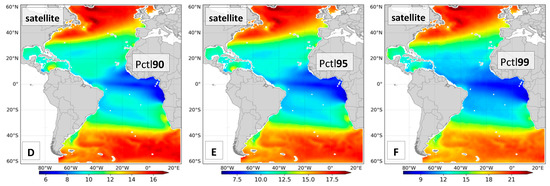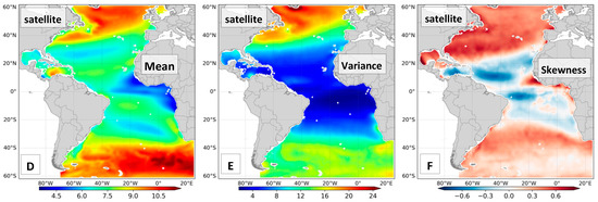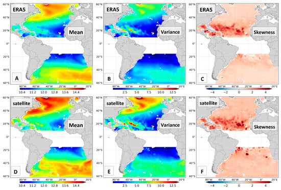 Figure 2 shows the direct comparison, with mean, variance, and skewness calculated for the exact same pairs of satellite/reanalysis in the 21 years selected. Figure 2A,D have very similar contours and patterns, indicating that ERA5 properly simulates the general atmospheric circulation regarding surface winds, with mean values varying from 4 m/s to 11 m/s. This result corroborates the global maps provided by Young et al. [42]. The westerlies and strong winds at mid-high latitudes are very similar between ERA5 and the satellites, both in terms of position and intensity. The Azores Anticyclone and the South Atlantic Anticyclone are also well positioned and well represented in ERA5. There are small differences between datasets, around 1 to 2.5 m/s, related to low winds at equatorial locations in the eastern portion of the Atlantic Ocean as well as in subtropical latitudes in the northwest part of the domain—where the satellite wind intensity is higher than ERA5. The variance and skewness panels confirm the quality of ERA5. The variance in the Northern Hemisphere is slightly higher (around 3 ) in satellite data than in ERA5, whereas for the South Atlantic both have more similar values—apart from the Malvinas Current, offshore Argentina, and the Benguela Current, offshore South Africa—which have small differences between datasets.