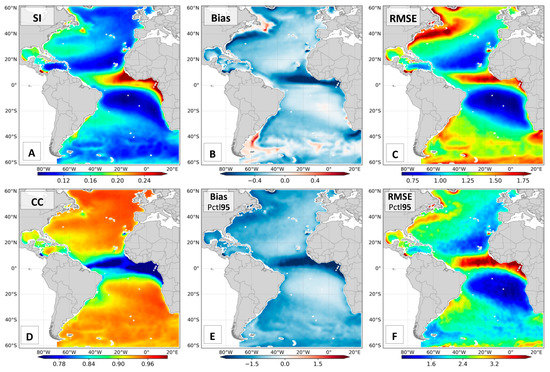 Assessment results using the error metrics described in Equations (1)–(4). (A) SI, (B) bias, (C) RMSE, and (D) CC computed for all data, and (E) Bias and (F) RMSE computed using only values above the 95th percentile. The blue colors (negative values) in the Bias panel indicate underestimation of ERA5 (model < observations) whereas red colors (positive values) indicate overestimation of ERA5 (model > observations).