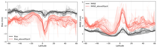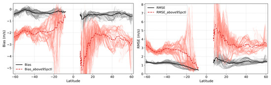 Reanalysis error (bias on the left and RMSE on the right) as a function of the latitudes, where the thin light-color lines show the results of each longitude, and the thick lines are the average over the longitudes. Black lines represent the latitudinal errors computed for all values and red lines represent the errors computed for values above the 95th percentile.