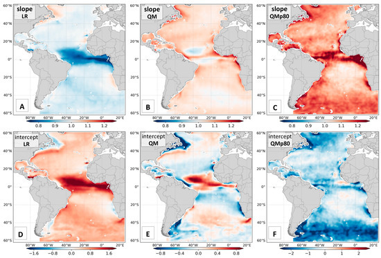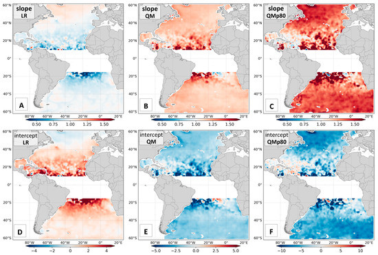 The results of Figure 14 have similar spatial distribution and patterns between LR and QM when compared to Figure 6. The major differences are the expanded ranges of parameters in Figure 14 that are coming mostly from tropical and subtropical latitudes. For the LR panels (Figure 14A,B), the slope is close to 1.0 in extratropical latitudes and below 1.0 in tropical areas. The QM map (Figure 14B) inverts this characteristic, with slopes above 1.0 in a great part of the domain and the highest values found in tropical areas.